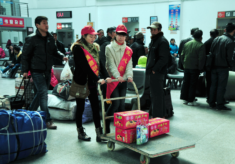 來自揚汽集團和團市委組織的志愿者們有的在進站口向旅客指引車站售票、候車等各個功能區(qū)位置;有的在服務臺回答旅客咨詢;有的在安檢處勸導旅客把攜帶的物品放上危險品檢查儀安檢;有的推著“雷鋒車”幫行李較多的旅客拖運箱包;有的給候車的旅客倒上一杯熱水;有的在檢票口幫助維持現(xiàn)場秩序,避免發(fā)生擁堵;還有的在候車大廳勸導旅客請勿吸煙……