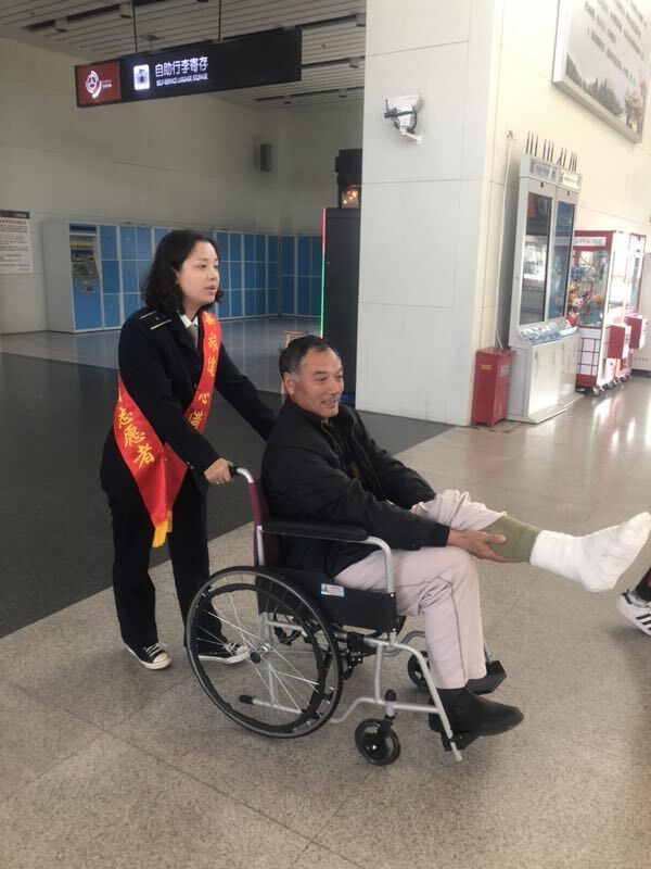 10月15日上午九點(diǎn)半左右,一位特殊的旅客來到揚(yáng)州汽車站,右腳綁著厚厚的石膏。服務(wù)班班長高娟經(jīng)過票務(wù)服務(wù)窗口的時候,看見他坐在地上,身邊還放著一堆行李。高娟關(guān)切地詢問道:“師傅,你去哪里的。磕愕哪_怎么了?”經(jīng)交談,該旅客原是在揚(yáng)州某工地打工的民工尤師傅,因?yàn)楣ぷ魇д`,在工地被鋼筋砸傷,工地老板特別安排另一位工友送尤師傅回昆山老家修養(yǎng)。