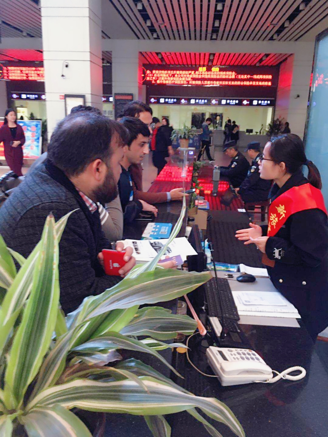 車站服務(wù)臺像往常一樣接待著旅客的問詢,這時,一群外國人急匆匆地跑來,說著不太流利的英文,急切的需要幫助。