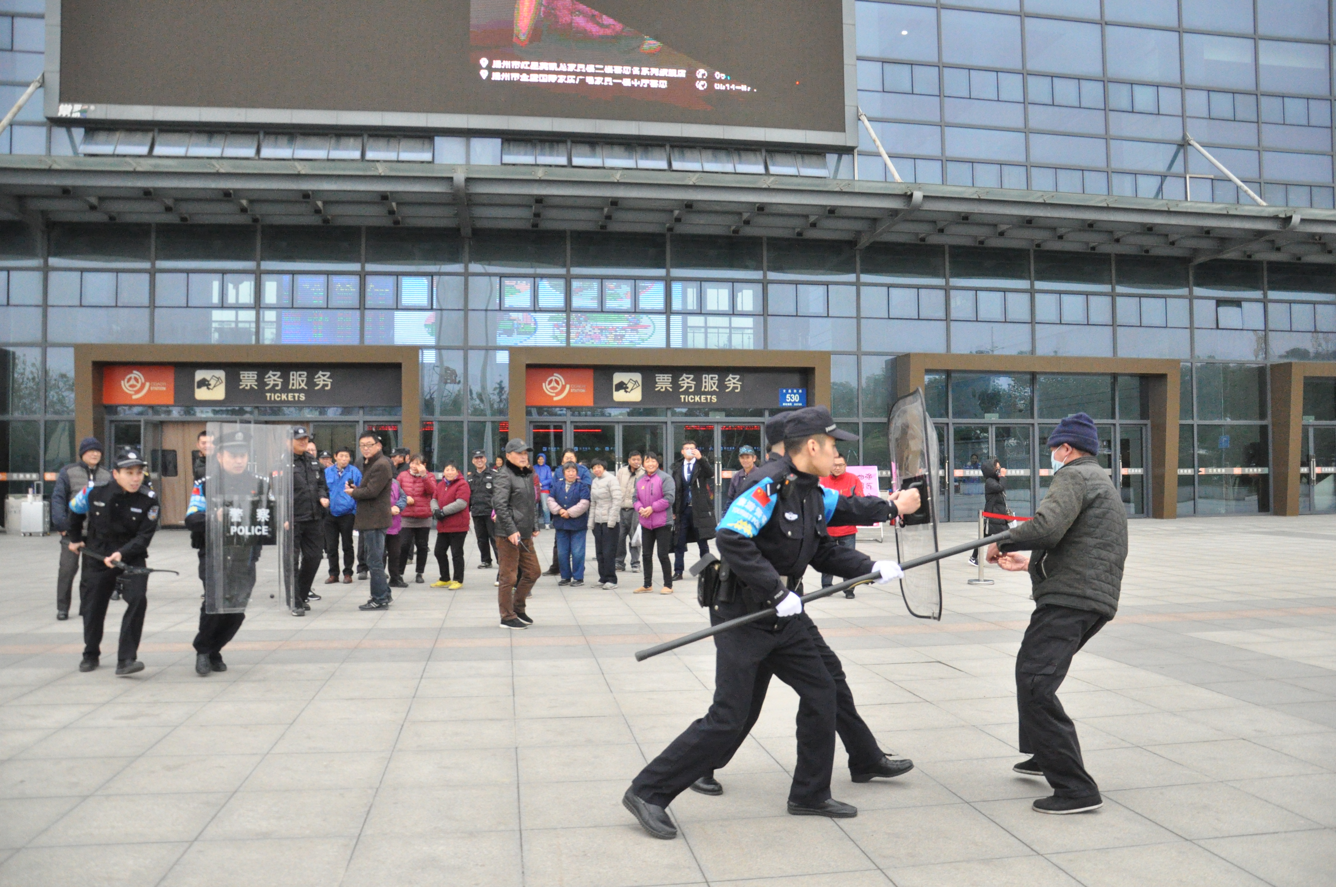為有效防范公共場所可能發(fā)生的暴力恐怖事件,加強(qiáng)車站工作人員安全防范意識,提高對突發(fā)事件的應(yīng)急處置能力,12月7日下午,揚(yáng)州站聯(lián)合揚(yáng)州市公安局公交治安分局汽車總站派出所,在站前廣場開展年度反恐防暴演練。