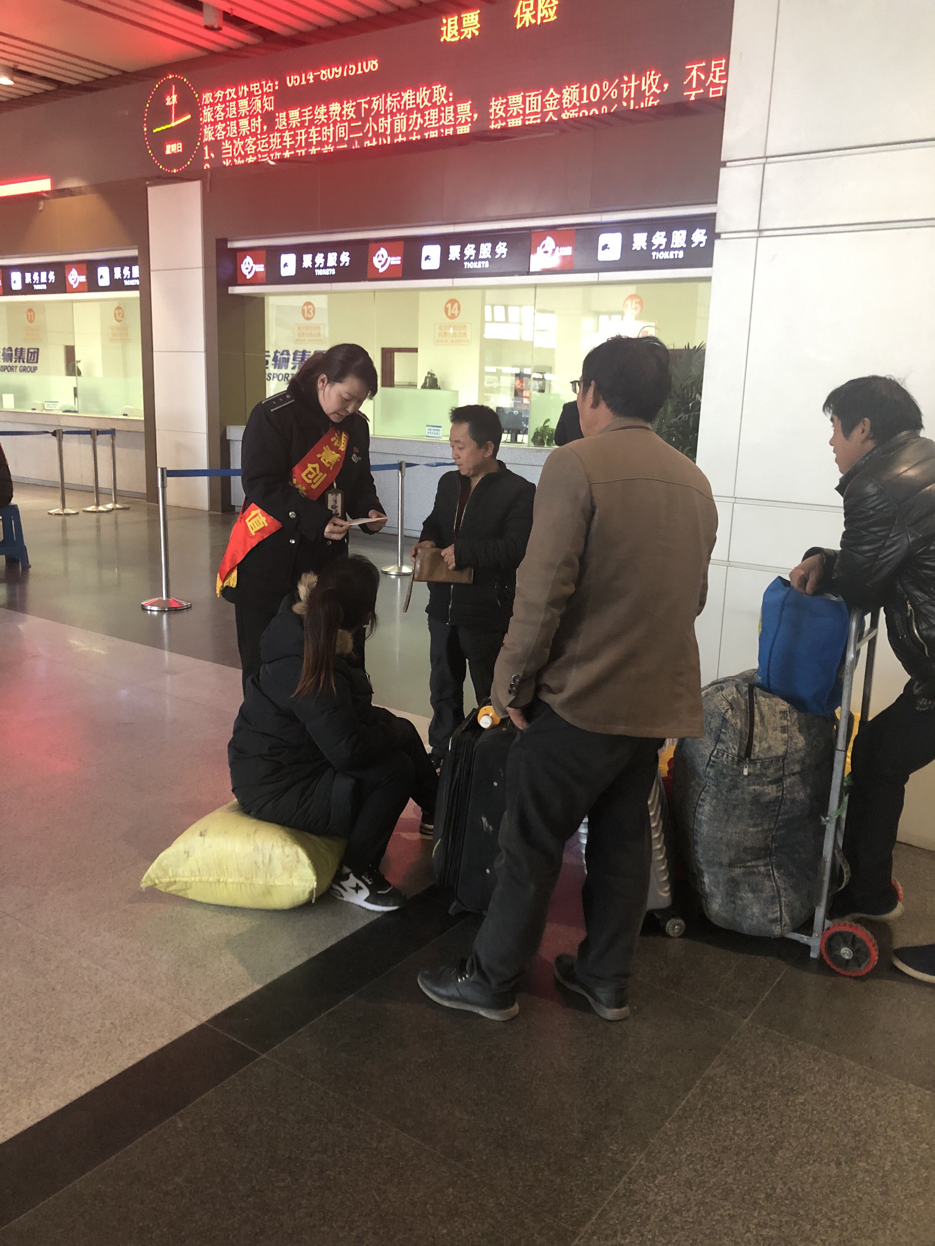1月27日下午三點(diǎn),服務(wù)班班長(zhǎng)尹海霞在現(xiàn)場(chǎng)巡查時(shí)發(fā)現(xiàn),售票大廳一角有四個(gè)農(nóng)民工模樣的旅客,望著眼前一大堆行李,說著外地方言,不停地議論著。