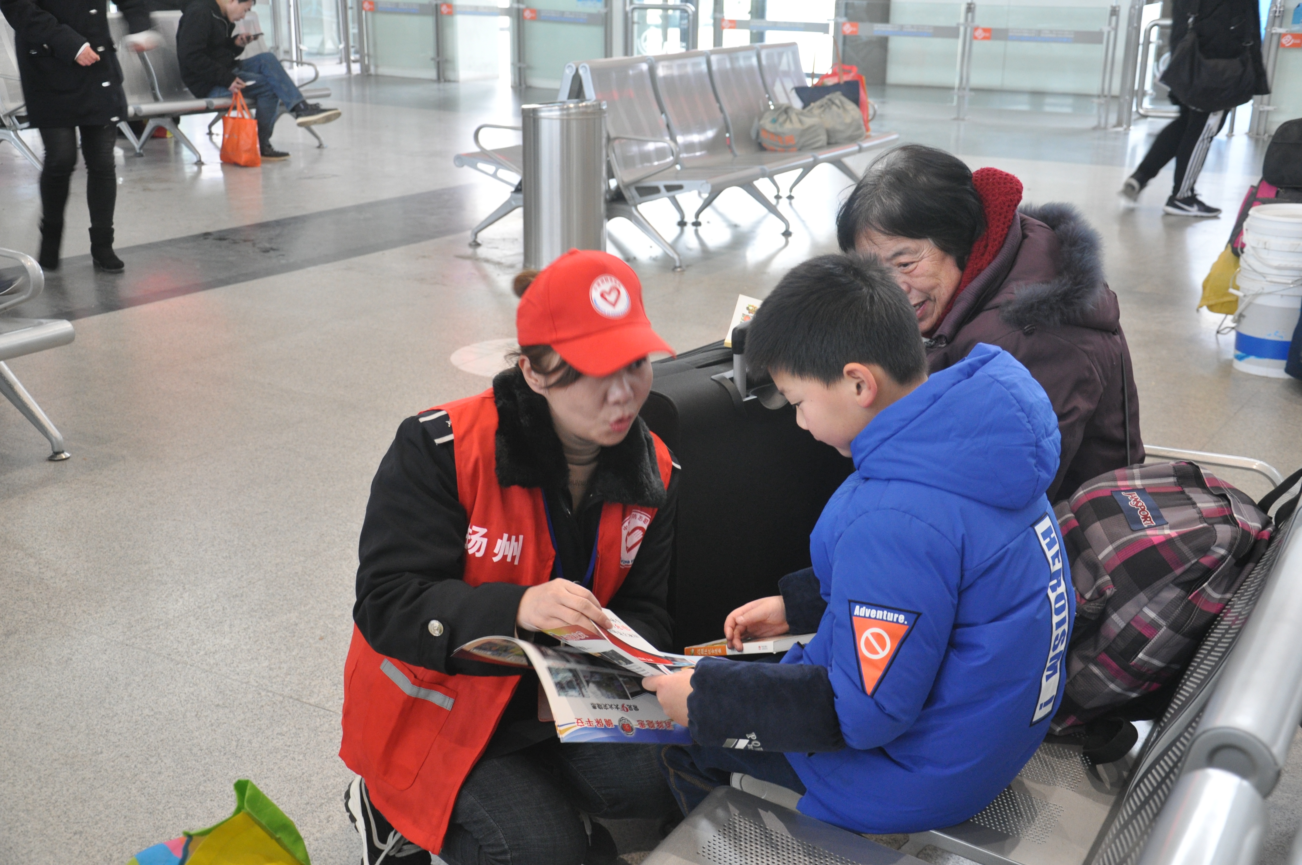 活動現(xiàn)場提供了種類繁多的書籍和春聯(lián),旅客們在宣傳臺前駐足,為孩子、親人或自己精心挑選,氣氛熱烈;顒蝇F(xiàn)場還安排了揚汽集團志愿者向來往旅客進(jìn)行消防安全知識的宣傳和講解。
