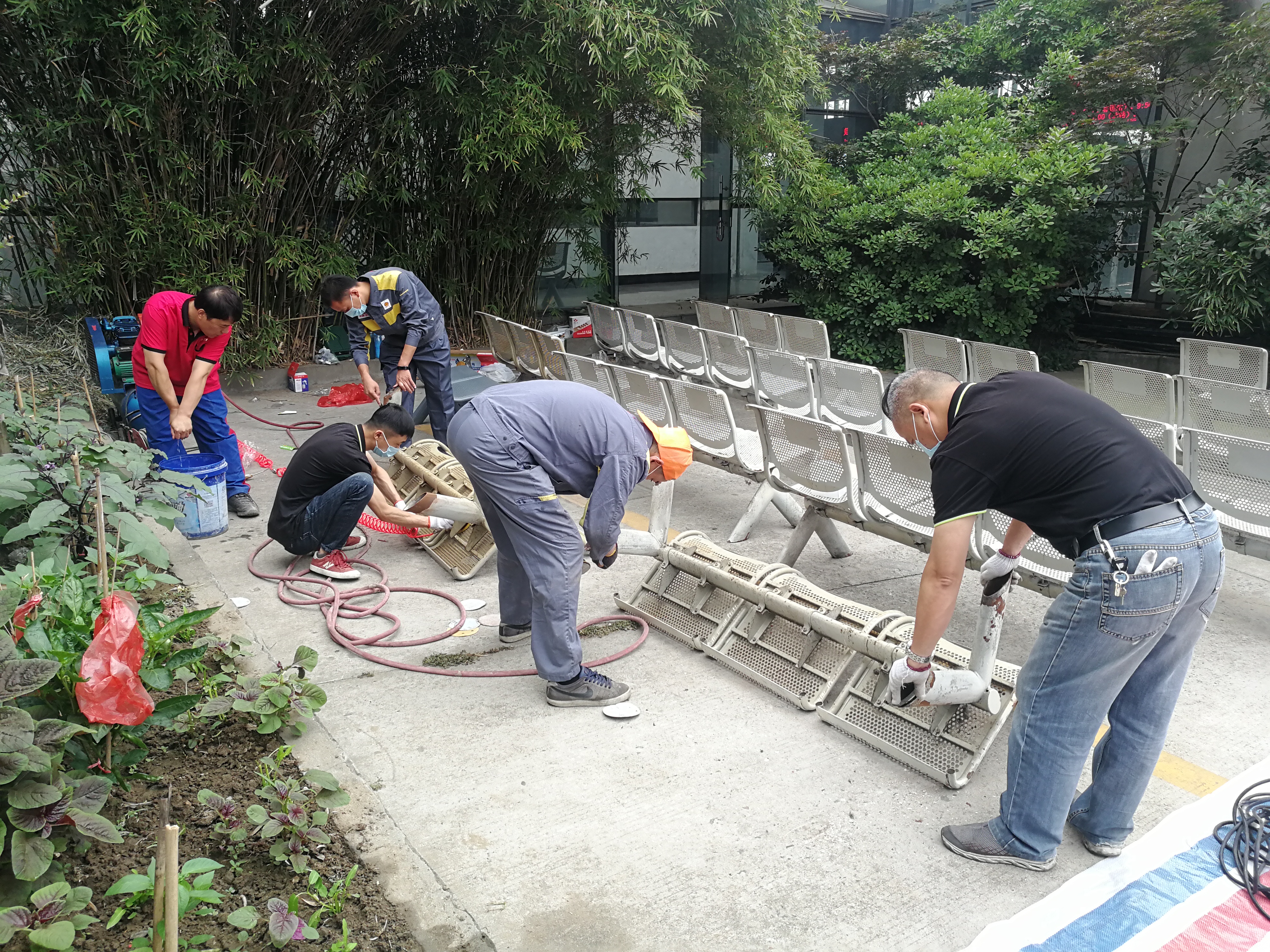 修理廠在接到江都分公司的任務(wù)請援,指派江都維修點,抽調(diào)總廠黨員骨干成立12人的突擊隊執(zhí)行這項任務(wù)。5月31日至6月1日兩天,從早上7點到晚上7點,突擊隊按照計劃分工明確,分成兩支隊伍同時進行,江都維修點負責(zé)座椅搬運、打磨、水洗、噴漆、歸位等系列工作,修理總廠負責(zé)車輛通道設(shè)計、標識、噴字以及停車位劃線任務(wù)。