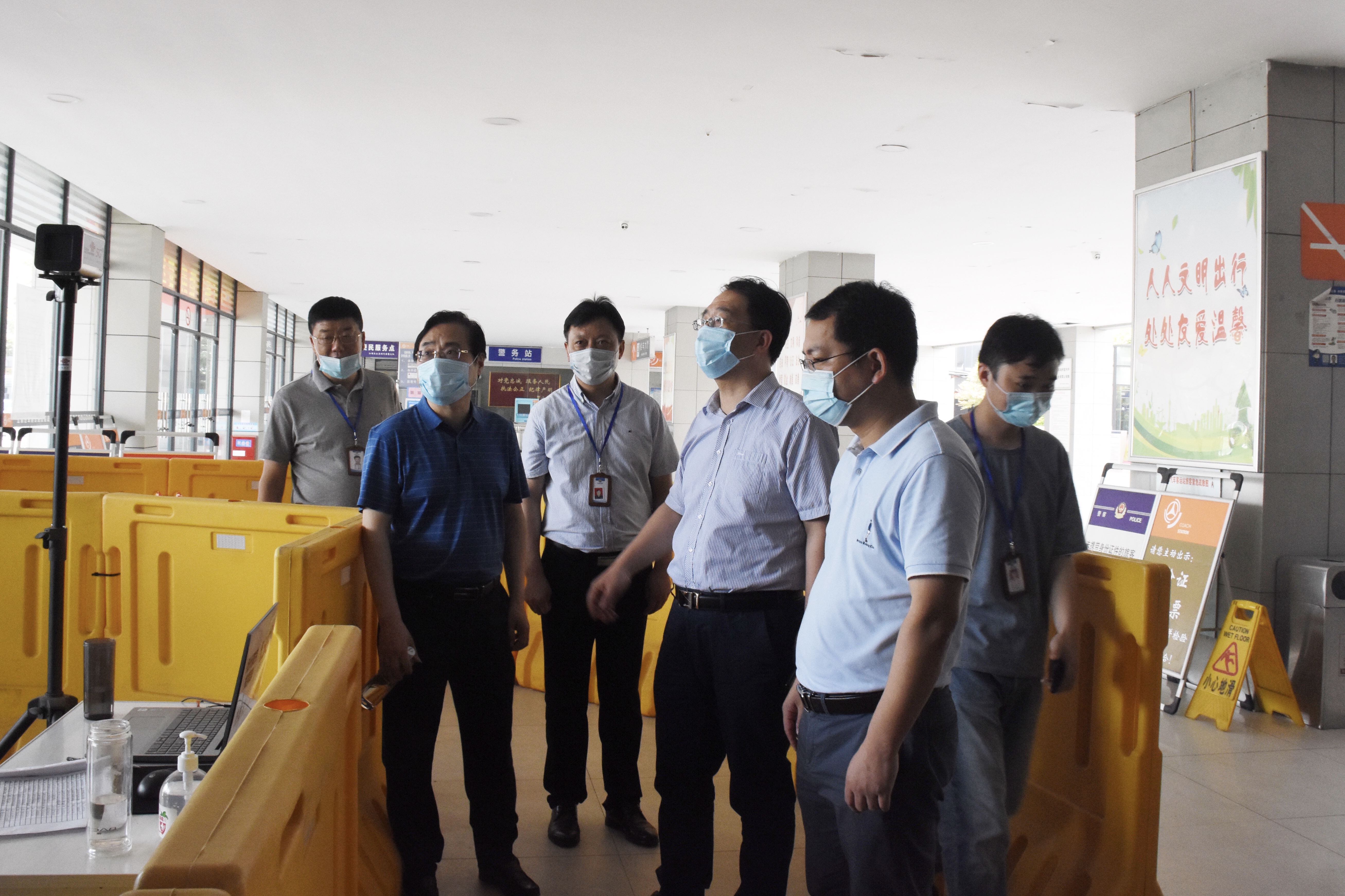 在江都站和西部客運樞紐,督查組先后查看了車站應(yīng)對復(fù)工返崗后的常態(tài)化疫情防控措施,就旅客進出管控登記、每日發(fā)車班次、場站及車輛消殺等情況詳細聽取了相關(guān)負責(zé)人的匯報。