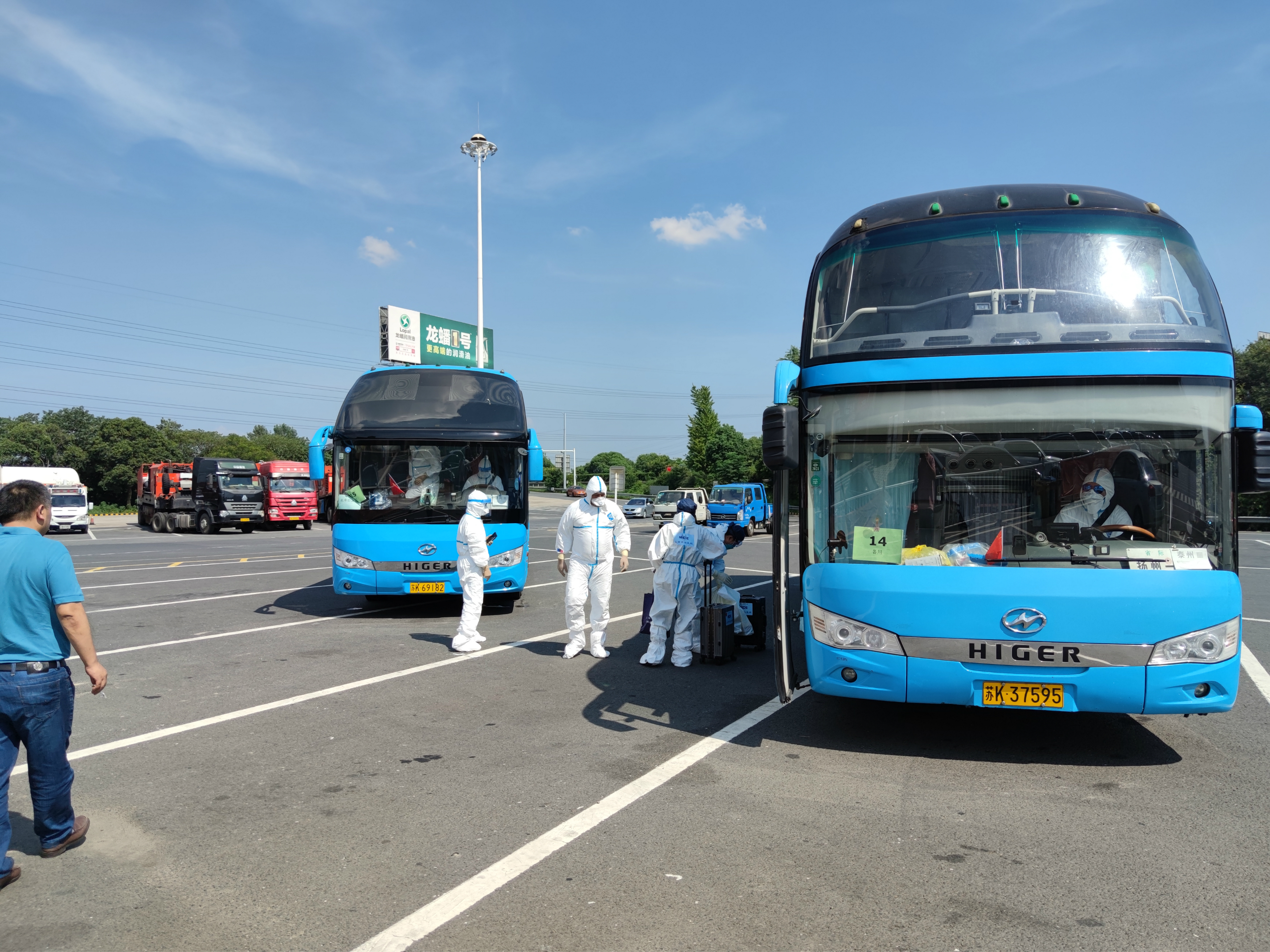 當(dāng)天氣溫達(dá)到36度,機(jī)坪溫度更是超過50度,在這種酷暑下,駕駛員全身穿戴密閉的防護(hù)服,對(duì)行車安全是巨大的挑戰(zhàn)。龔宇峰董事長(zhǎng)趕赴現(xiàn)場(chǎng),再次對(duì)駕駛員抗高溫,保安全進(jìn)行了交代。中午11時(shí)40分,首批車輛從機(jī)場(chǎng)出發(fā),至14時(shí)11分最后一批車出發(fā),將二百多名境外返揚(yáng)人員運(yùn)送至相關(guān)酒店。16時(shí)50分,所有車輛圓滿完成任務(wù),回到指定地點(diǎn),接受消毒和檢測(cè)。