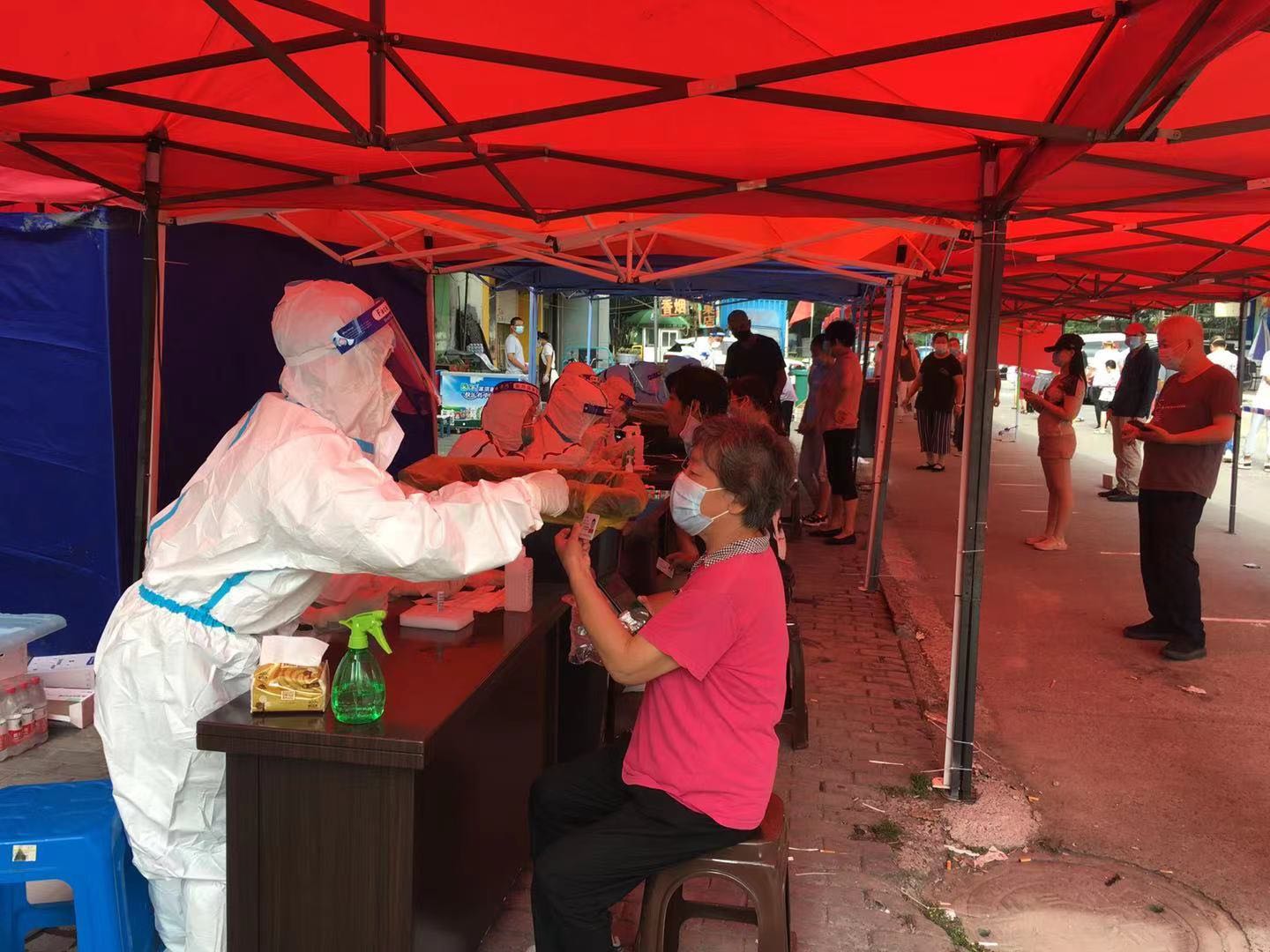 六點半核酸檢測準時開始,我們穿戴了防護面罩、N95口罩、手套、頭套等常規(guī)防護用具之外,還穿上防護服。我剛開始操作還不是太熟練,還擔心自己能不能把分配的工作做好,是否影響到核酸檢測的進度,但是這種緊張感很快被前來進行檢測核酸的居民沖淡了。經(jīng)過不斷地熟悉和調(diào)整之后,我與搭檔配合得越來越默契,隨之工作速度加快了很多,效率也提高了不少。
