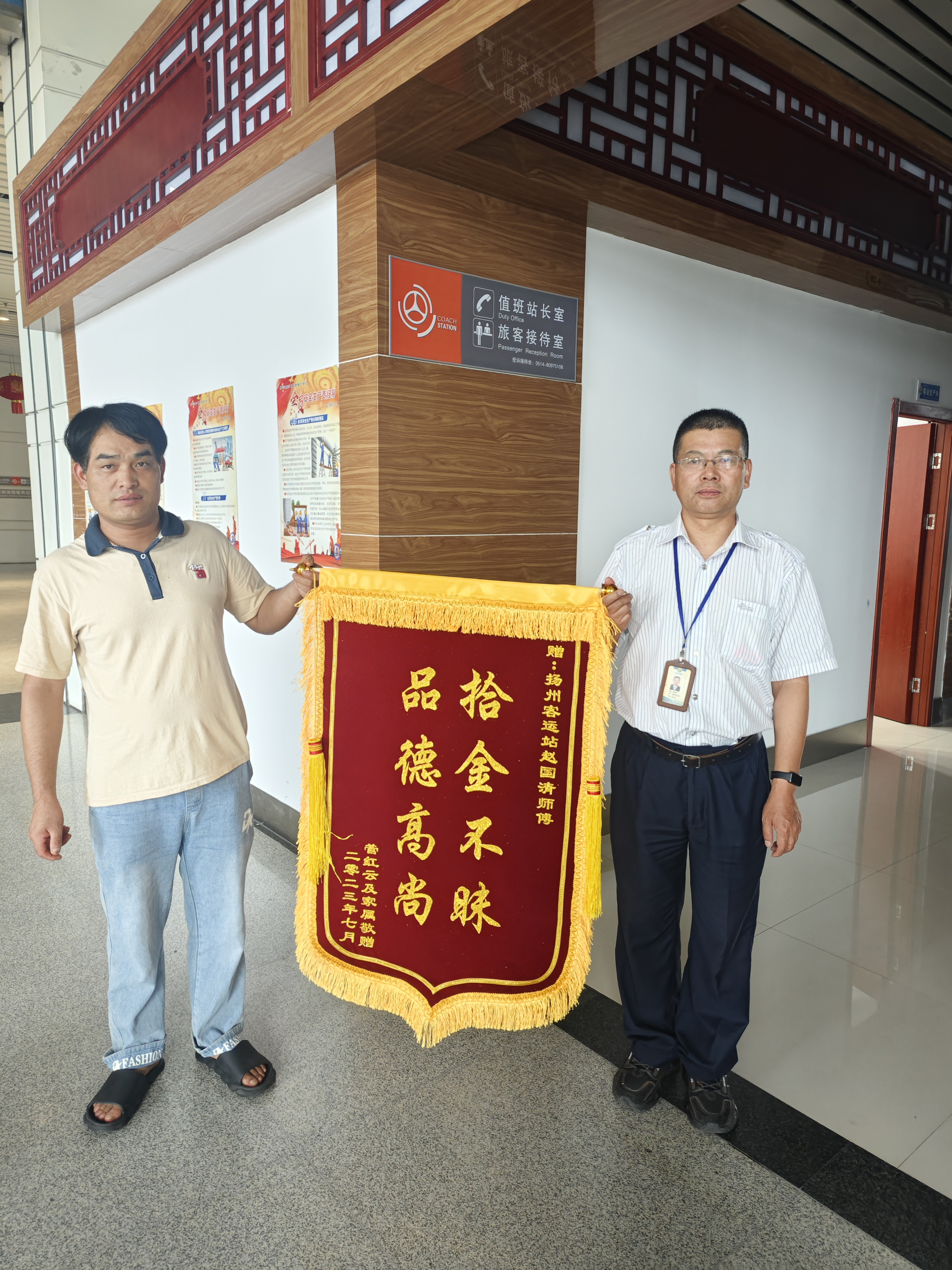 7月18日,失主管先生專(zhuān)門(mén)制作了一面“拾金不昧,品德高尚”的錦旗到揚(yáng)州汽車(chē)站值班室對(duì)好人趙國(guó)清表示感謝。接下來(lái),揚(yáng)汽集團(tuán)站務(wù)中心將繼續(xù)以黨建為引領(lǐng),以榜樣為鏡,向榜樣看齊,充分發(fā)揮先鋒模范帶頭作用,深入推動(dòng)“星級(jí)服務(wù),溫馨之旅”黨建微品牌工作走深走實(shí)。