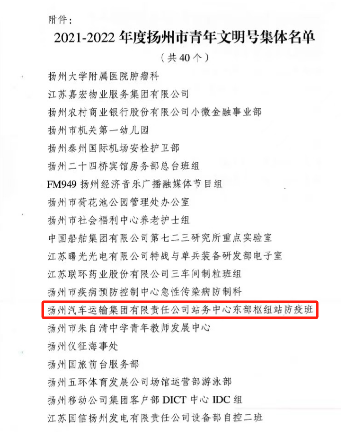 近日,團市委下發(fā)的《關(guān)于命名2021-2022年度市級青年文明號的決定》,揚汽集團東部樞紐汽車站防疫班榮獲青年文明號集體榮譽。