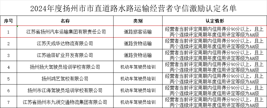 揚汽集團(tuán)獲2024年度揚州市市直道路運輸經(jīng)營者守信激勵名單認(rèn)定